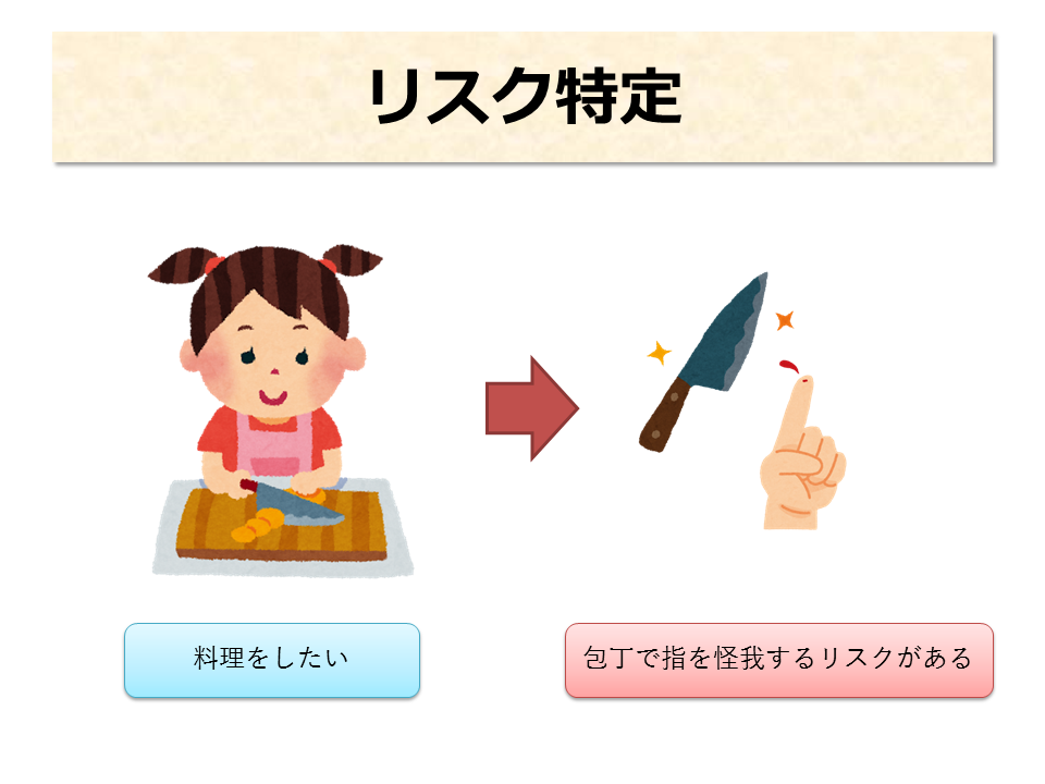 「料理をするとき、包丁で指を怪我する可能性がある」というリスクを認識します。