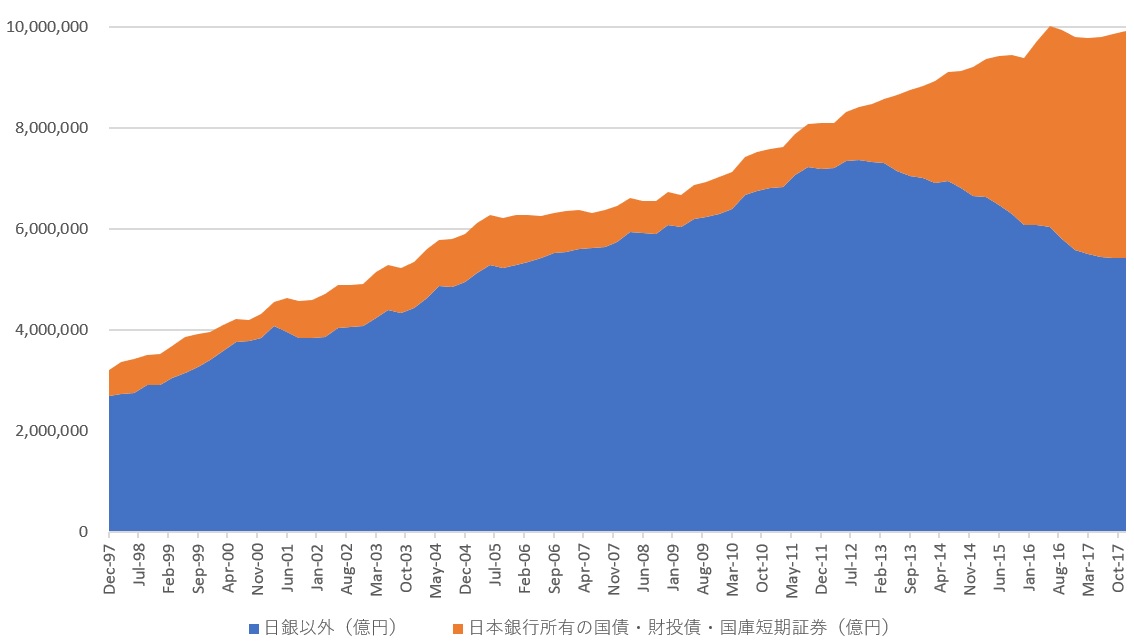 日本銀行所有の国債・財投債・国庫短期証券と日銀以外保有分(億円)