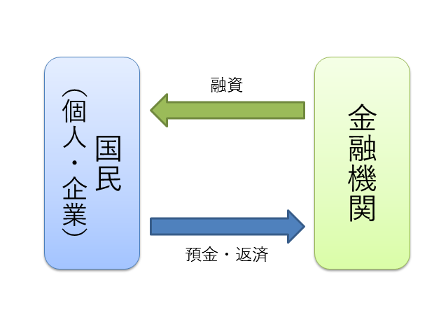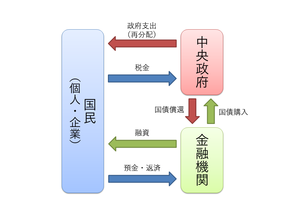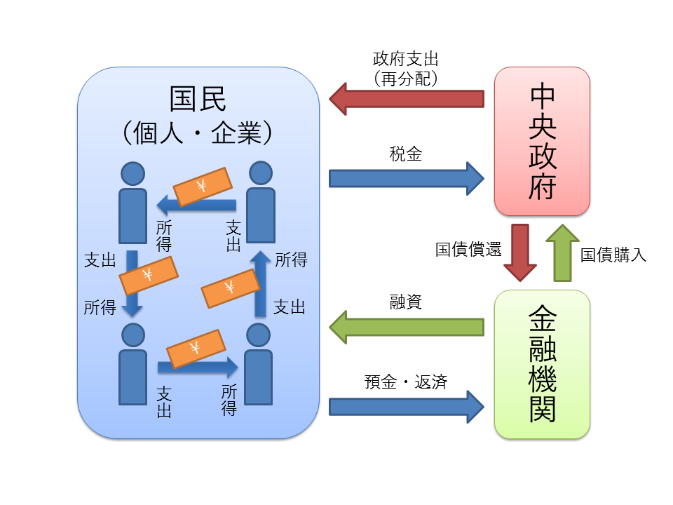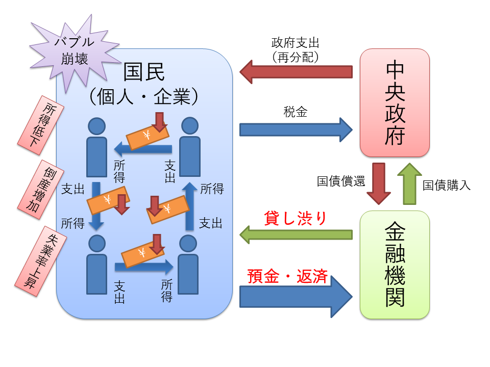 そのときは、政府が借りて使わないと、上図の国民側にお金が回らなくなります。