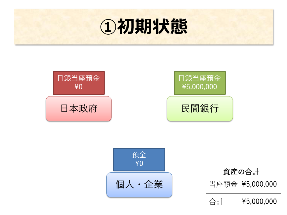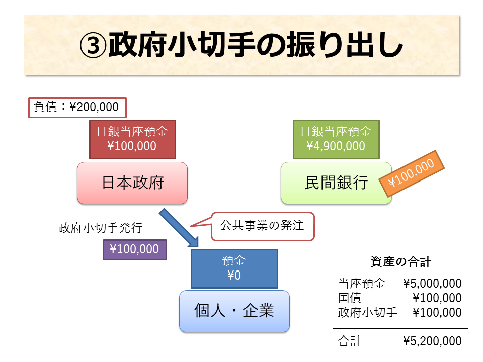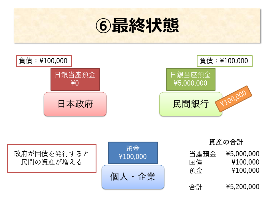 - 政府が国債を発行し、事業を発注すると、民間の資産が増える。