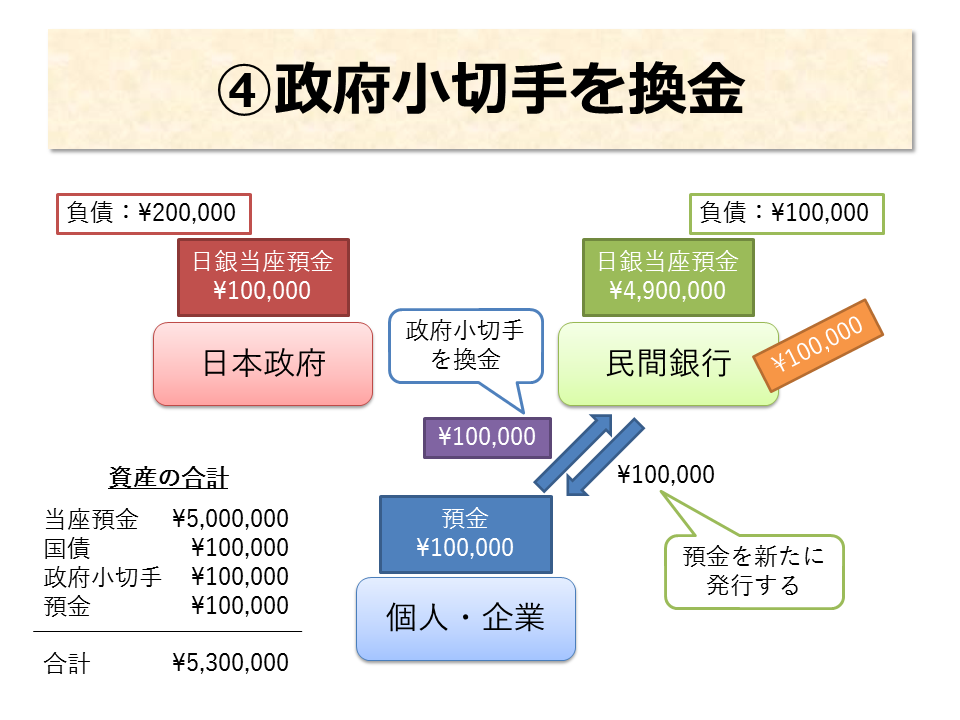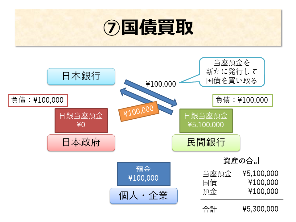 - 民間銀行に、国債という資産が¥100,000 増えた