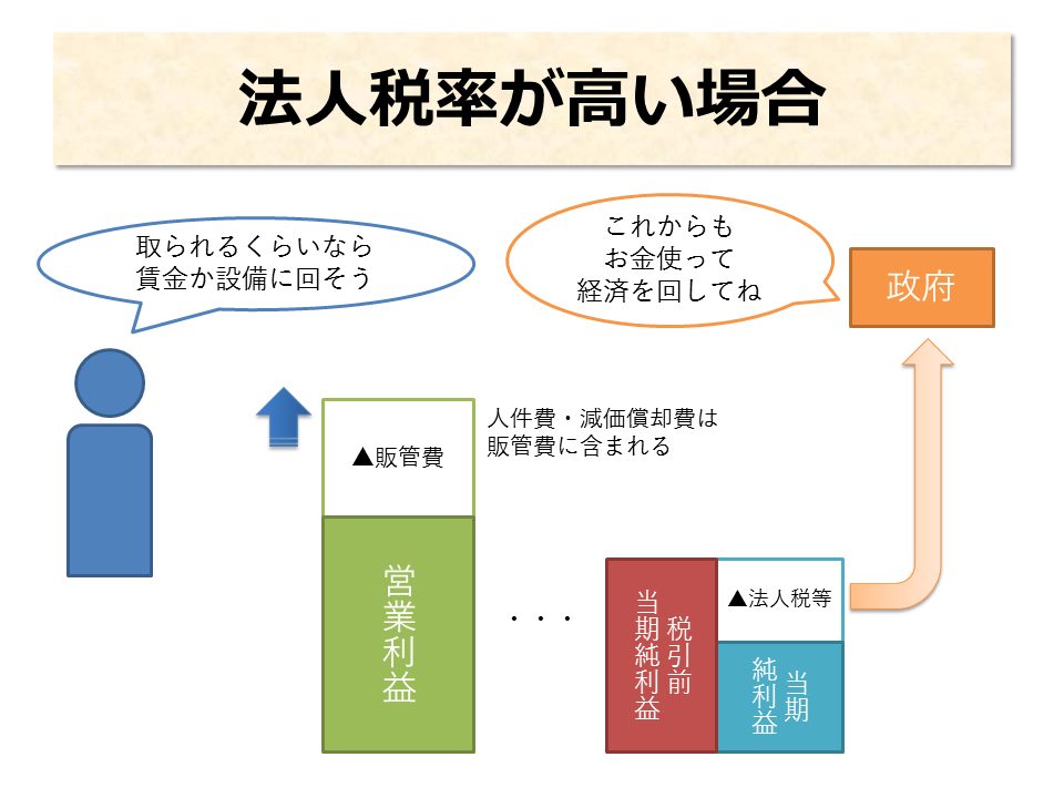 - 損益計算書上、賃金や設備投資の費用を引いた後の利益に法人税がかかる。