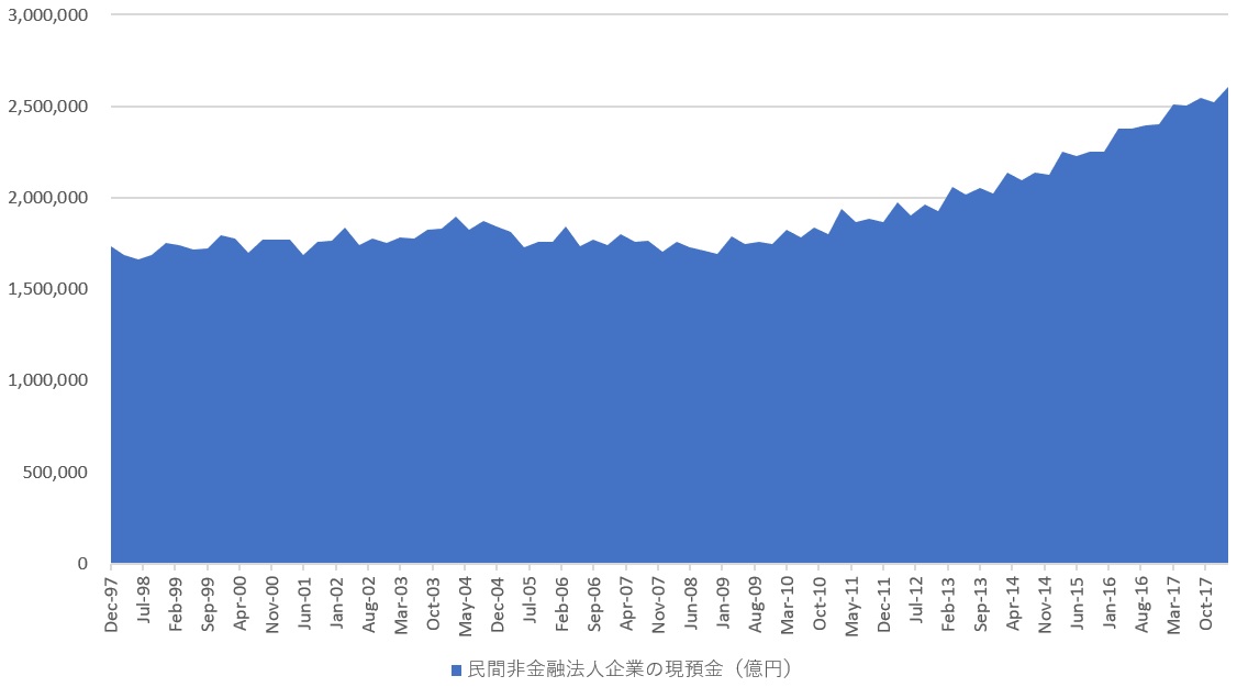 日本の一般企業(民間非金融法人企業)の現預金(億円)