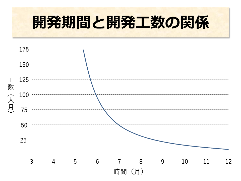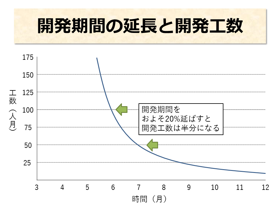 - 開発期間を 20% 延ばすと、開発工数は半減する。